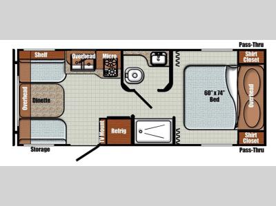 Sleeps 3 Length 23 ft 1 in Ext Width 7 ft 6 in Ext Height 10 ft 2 in Int Height 6 ft 11 in Hitch Weight 370 lbs Dry Weight 3090 lbs Cargo Capacity 1294 lbs Fresh Water Capacity 30 gals Grey Water Capacity 33 gals Black Water Capacity 33 gals Tire Size 14" Furnace BTU 25000 btu Available Beds Queen Refrigerator Type 12V Refrigerator Size 8 cu ft Shower Size 24" x 36" Number of Awnings 1 LP Tank Capacity 20 lbs Water Heater Type Tankless AC BTU 15000 btu Awning Info Electric with LED Lights Axle Count 1 Number of LP Tanks 2 Shower Type Standard Electrical Service 30 amp Similar Travel Trailer Floorplans