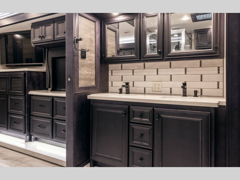 Sleeps 7 Slides 4 Length 41 ft 4 in Ext Width 8 ft 5 in Ext Height 13 ft 3 in Int Height 6 ft 11 in Interior Color Gelato, Mesa, Titanium Exterior Color Gen 10, Gen 11; Bordeaux, Waterfall, Frosted Granite, Nasa, White Mahogany. Midnight Blue Edition Hitch Weight 10000 lbs GVWR 40000 lbs Fresh Water Capacity 100 gals Grey Water Capacity 100 gals Black Water Capacity 55 gals Tire Size 295/80R22.5 Furnace BTU 60000 btu Generator 10.0kW Onan Quiet Diesel Fuel Type Diesel Engine Cummins L9 Chassis Freightliner PowerGlide XC Raised Rail Rear Horsepower 450 hp Fuel Capacity 100 gals Wheelbase 266 in Available Beds King Torque 1250 ft-lb Refrigerator Type Stainless Steel Residential with French Doors and Bottom Freezer Refrigerator Size 25 cu ft Convection Cooking Yes Cooktop Burners 2 Shower Size 31.75" x 40" Number of Awnings 2 Axle Weight Front 16000 lbs Axle Weight Rear 24000 lbs LP Tank Capacity 35.7 gals AC BTU 45000 btu Basement Storage 232 cu. ft. TV Info LR TV, BR Mounted TV, Ext. TV Awning Info Girard Power Patio and Window Washer/Dryer Available Yes Gross Combined Weight 50000 lbs Shower Type Shower w/Seat Electrical Service 50 amp Similar Floorplans
